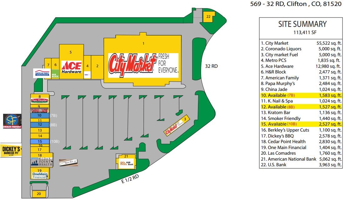 Retail unit available at Coronado Plaza Shopping Center! Great visibility and accessibility at the I-70 Business Loop and 32 Road intersection. The anchor tenants include City Market, Ace Hardware, and ANB Bank. Quick, convenient access to Interstate 70. Center features 300+ parking spaces. Monument and building signage available. Tenant pays NNN.