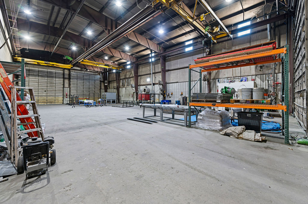The improvements feature multiple office suites and shop areas, providing the ability to segment operations or accommodate multiple users. The warehouse components are equipped with overhead doors of varying heights and include bridge cranes, supporting heavy industrial or service-oriented users.