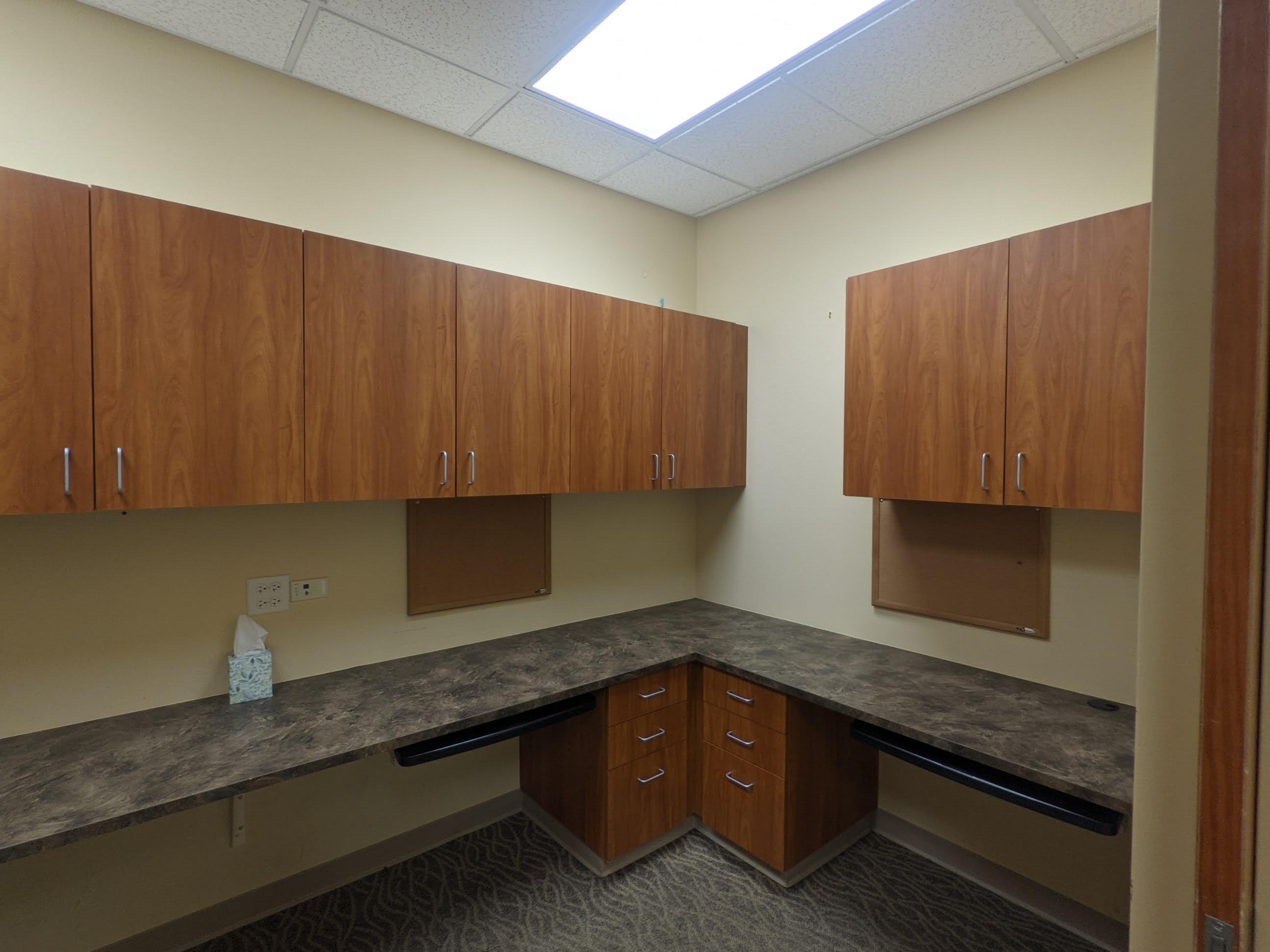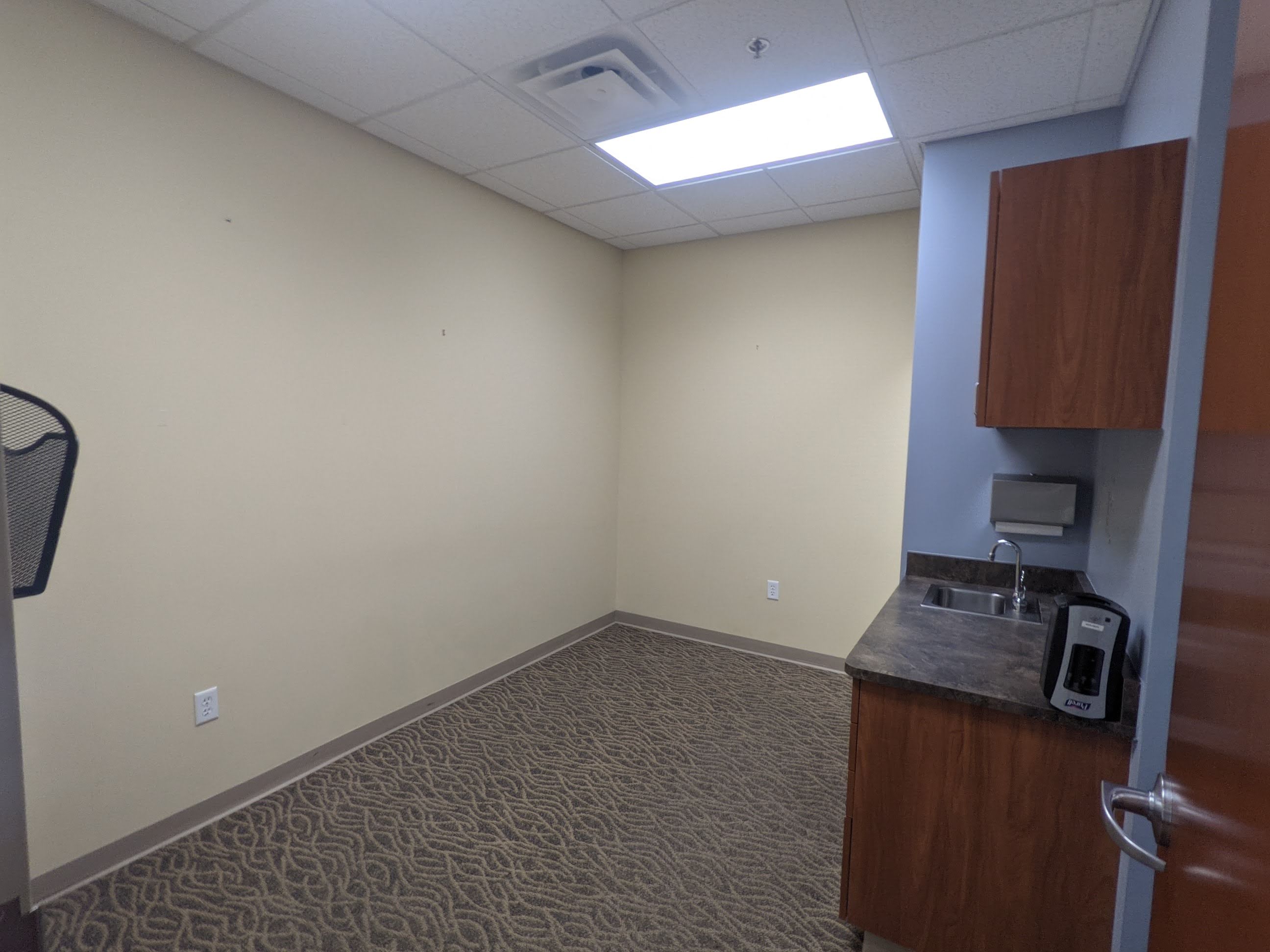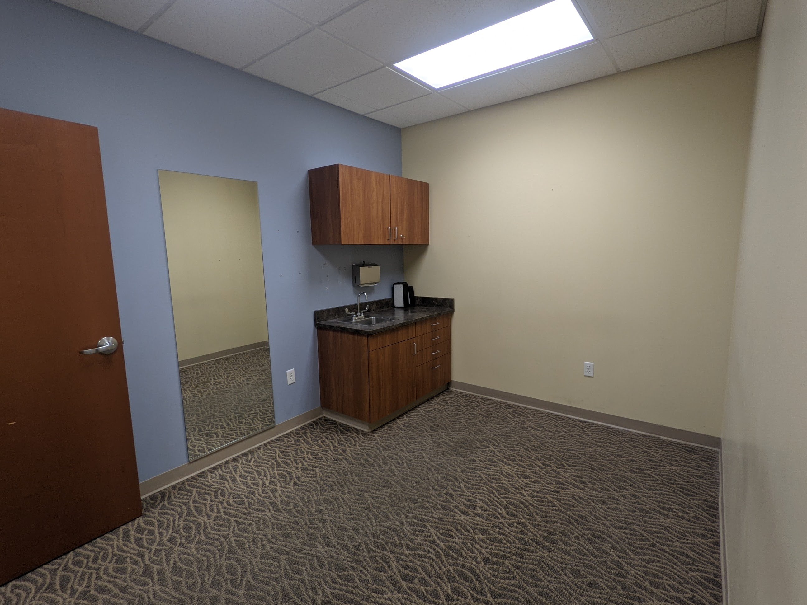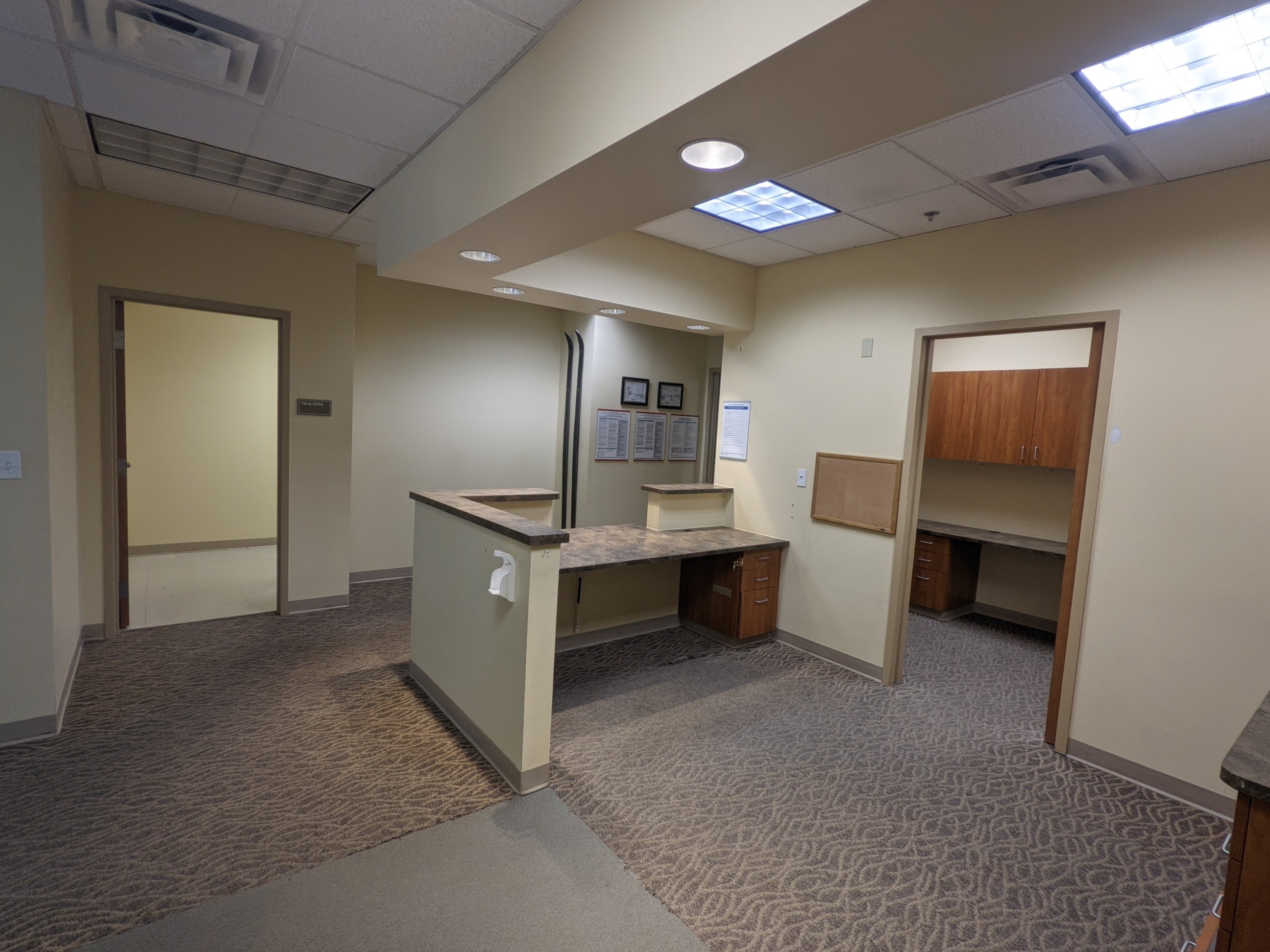 Turnkey physical therapy space inside Class A medical office building on campus in Frisco, CO. Two private offices, a staff office and reception area in this occupational space plan.