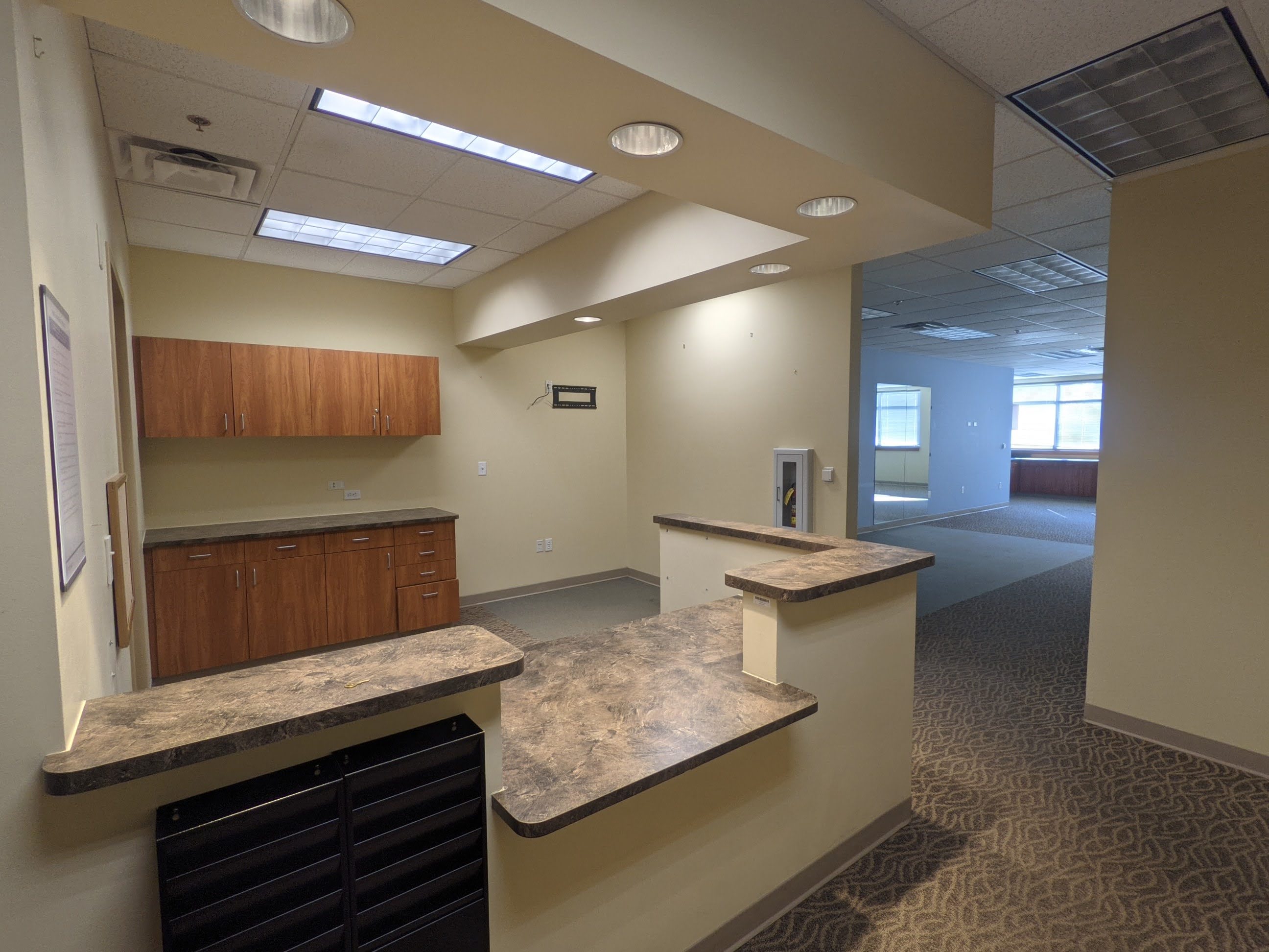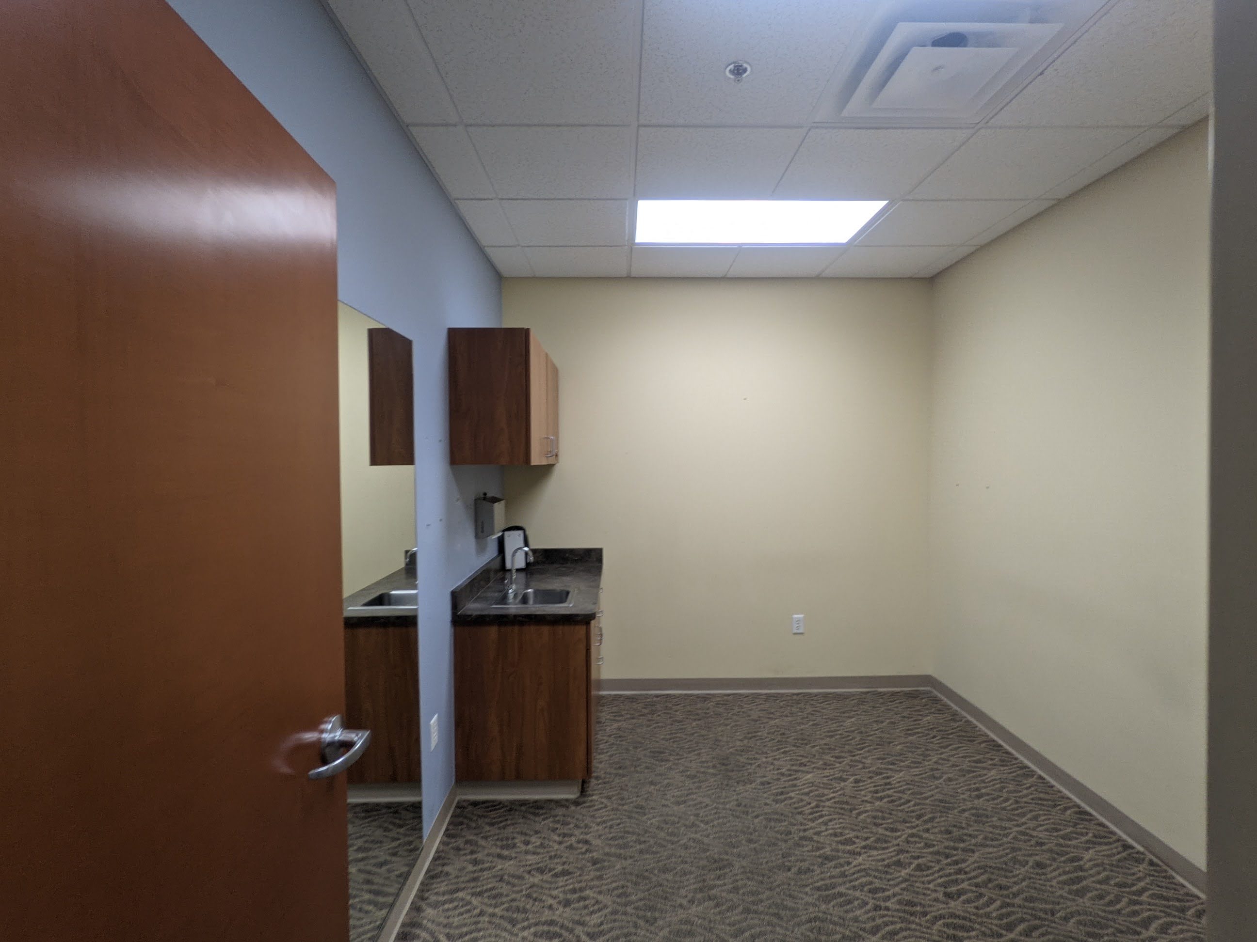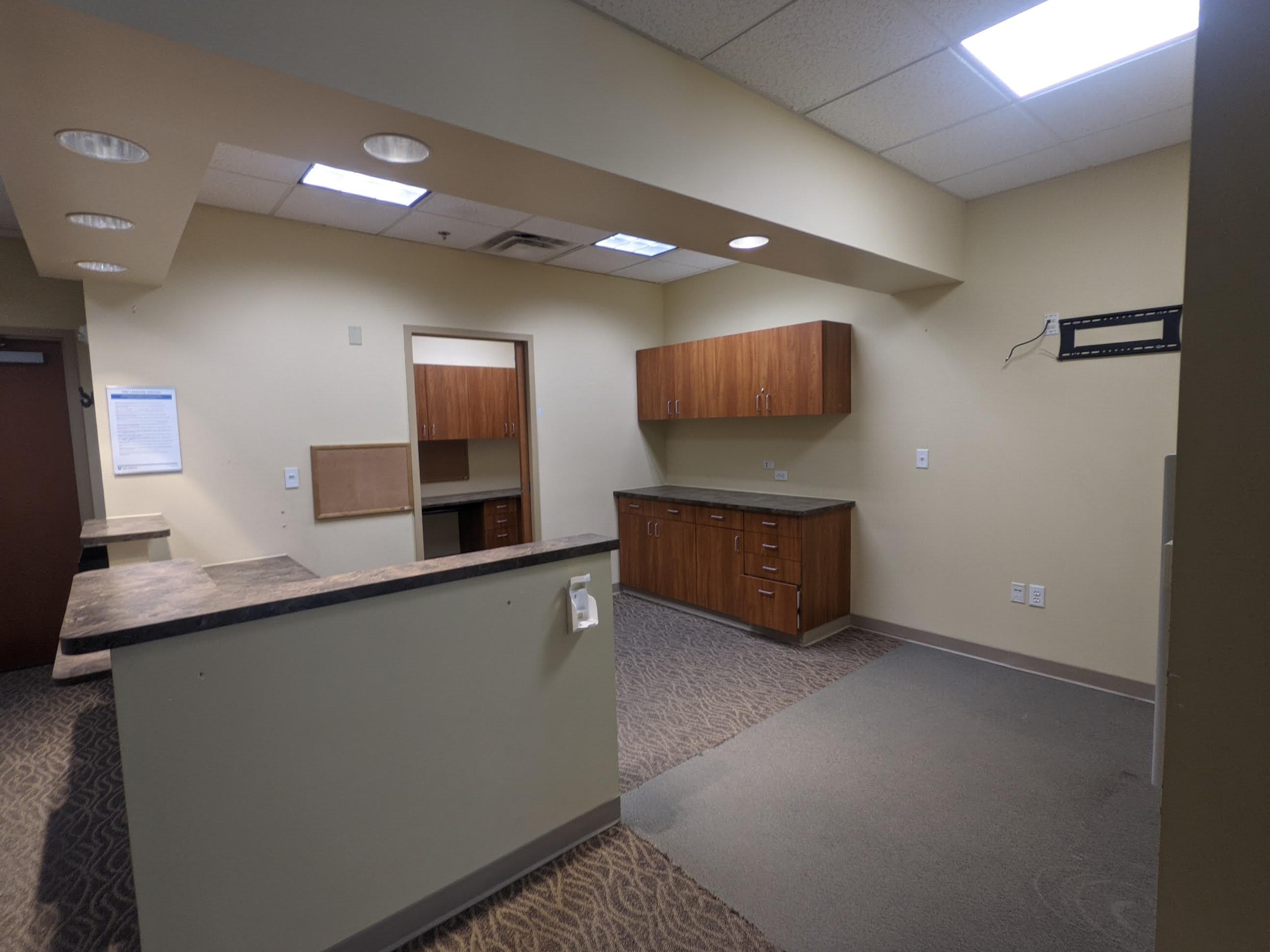 Turnkey physical therapy space inside Class A medical office building on campus in Frisco, CO. Two private offices, a staff office and reception area in this occupational space plan.